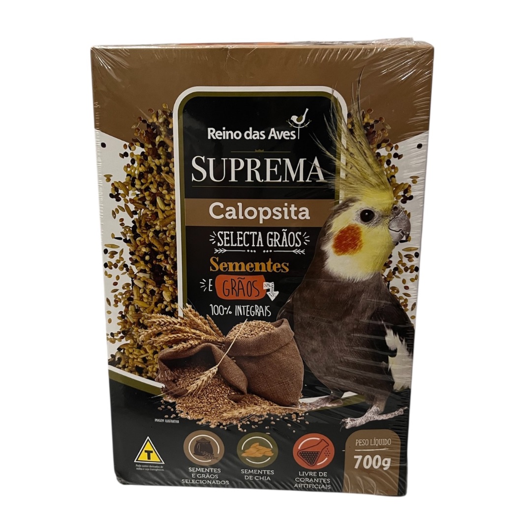 Essa aqui é a ração Suprema Calopsita, da Reino das Aves. É uma mistura de sementes e grãos 100% integrais, super nutritiva e sem corantes artificiais. Ela tem sementes selecionadas e até chia, que ajuda na saúde das penas e na digestão. É uma opção bem completa pra quem quer manter a calopsita saudável e com uma alimentação mais natural.